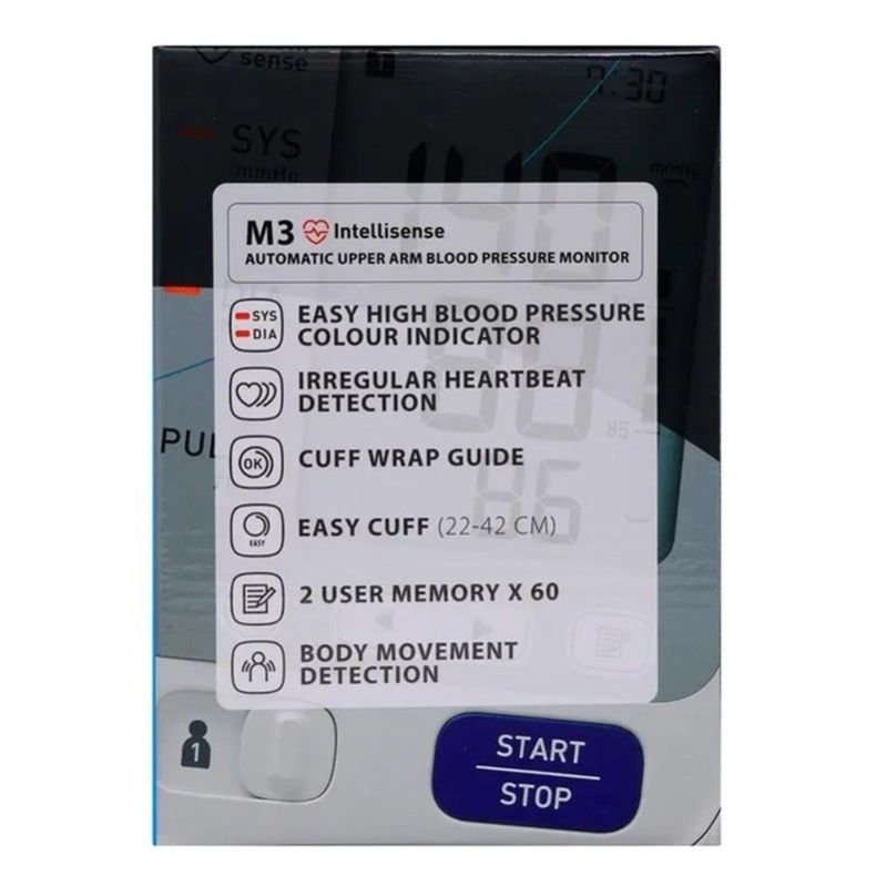 The Omron M3 Automatic Upper Arm Blood Pressure Monitor is a fully automatic blood pressure monitor that offers everything necessary for comfortable, quick and accurate blood pressure measurements and features the OMRON wide-range cuff. Contents: Monitor, arm cuff, storage case, 2 instruction manuals, 4 AA batteries.