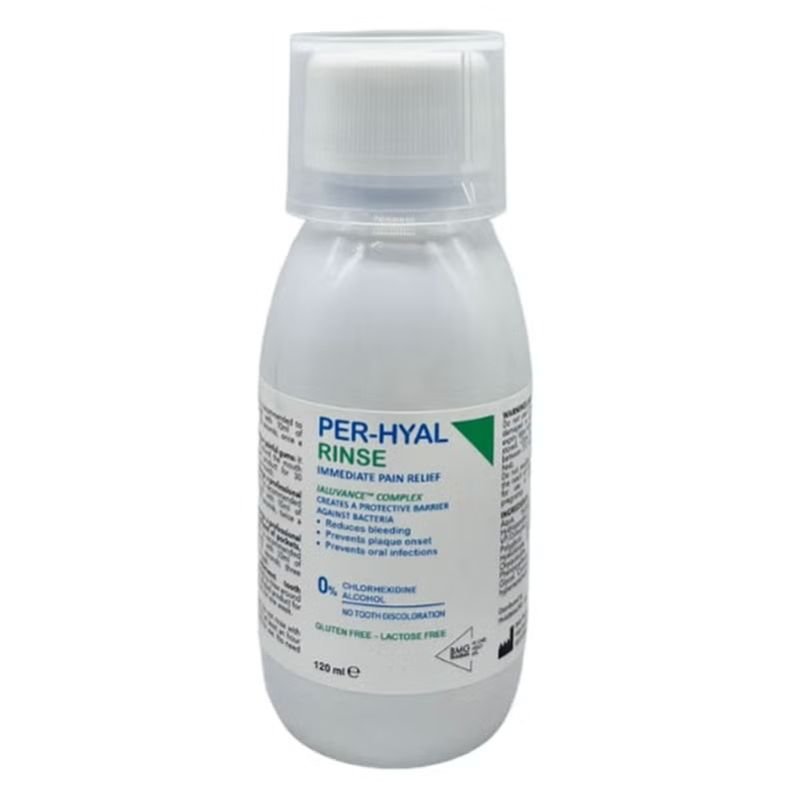Per-Hyal Rinse is a non-staining mouthwash with a patented IALUVANCE complex of Hyaluronic acid, glycine, and hydrogen peroxide, designed to relieve gum inflammation, prevent plaque, and promote tissue healing.