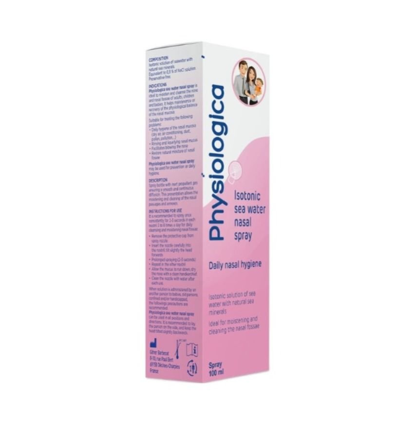 Physiological seawater nasal spray is ideal to moisten and cleanse the nose and nasal fossae of adults, children and babies. It helps maintain or recover the physiological balance of the nasal mucosa.