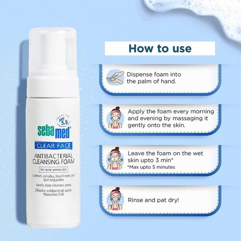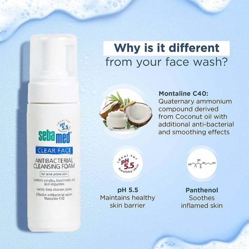 Sebamed Clear Face Antibacterial Cleansing Foam effectively penetrates the pores for mild pore-deep cleansing. It protects against skin barrier damage during cleansing, leaving skin smooth and hydrated. For use on wet or dry skin, its pH 5.5 value of healthy skin supports and protects the natural barrier function of the skin s acid mantle.