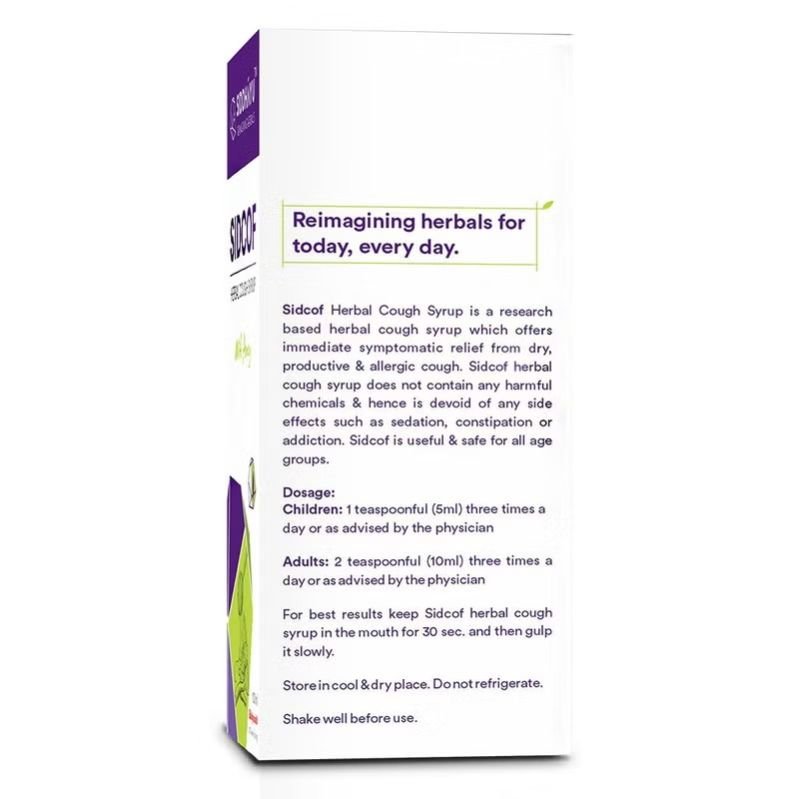 - Dosage: Children: 1 teaspoonful (5ml) three times a day or as advised by the physician. Adults: 2 teaspoonful (10ml) three times a day or as advised by the physician. For best results keep Sidcof herbal cough syrup in the mouth for 30 sec. and then gulp it slowly. Store in cool & dry place. Do not refrigerate. Shake well before use.