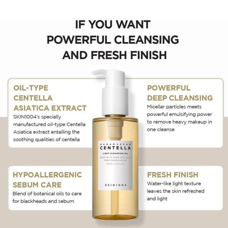 - Pump an appropriate amount of the Skin1004 Madagascar Centella Asiatica Light Facial Cleansing Oil onto your dry palm. Typically, one or two pumps should suffice, depending on how much makeup and sunscreen you re wearing.