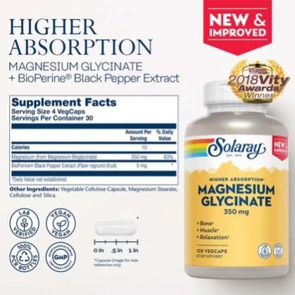 Solaray Magnesium Glycinate vegetarian capsule appears to be a supplement aimed at providing various health benefits associated with magnesium bisglycinate, a form of magnesium known for its absorption and bioavailability. Magnesium is crucial for muscle function and bone health. Magnesium bisglycinate may aid in muscle relaxation and support bone density. Magnesium plays a role in neurotransmitter function and mood regulation. Adequate magnesium levels may help calm the mood. Magnesium has been associated with improved sleep quality. It may help relax muscles and calm the mind, aiding in better sleep. Also, magnesium is important for maintaining a healthy heart rhythm and supporting cardiovascular function. The supplement is suitable for vegetarians, which may be important for individuals who prefer plant-based diets. The inclusion of black pepper extract may aid in digestion, possibly by enhancing nutrient absorption. Overall, Solaray Magnesium Glycinate Veg Caps seem to offer a range of benefits related to muscle and bone health, migraine relief, mood regulation, sleep quality, heart health, dental health, and digestive comfort, making them a potentially valuable supplement for those seeking these benefits.