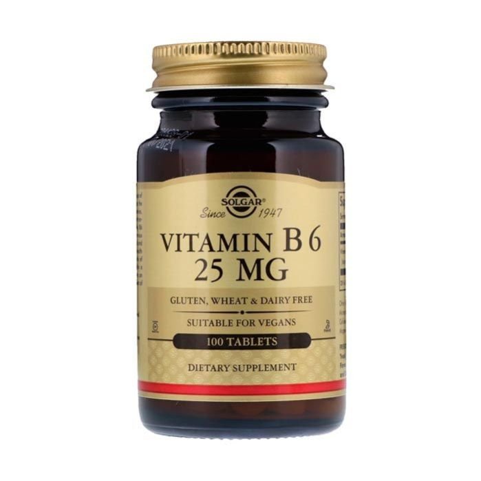 Solgar Vitamin B6 25 mg 100 Tablets are high-quality dietary supplements for energy metabolism and wellness, providing a potent dose of vitamin B6 without artificial flavors or preservatives.