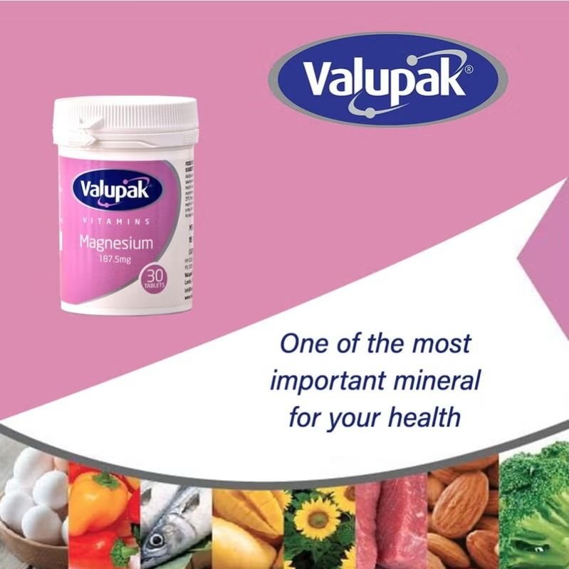 Valupak Magnesium 187.5mg Tablet is a trace mineral in a 50% NRV, one-a-day formulation for easy consumption. Magnesium contributes to normal psychological and nervous system function in addition to helping maintain normal bones and teeth and playing a role in normal muscle function. Magnesium is a cofactor in more than 300 enzyme systems that regulate diverse biochemical reactions in the body, including protein synthesis, muscle and nerve function, blood glucose control, and blood pressure regulation. Magnesium is required for energy production, oxidative phosphorylation, and glycolysis. Magnesium acts as the gatekeeper for NMDA receptors, which are involved in healthy brain development, memory, and learning. It prevents nerve cells from being overstimulated, which can kill them and may cause brain damage. Magnesium helps your heart muscle cells relax by countering calcium, which stimulates contractions. These minerals compete with each other to ensure heart cells contract and relax properly. Magnesium acts as a natural calcium blocker, helping your muscle cells relax after contracting. When magnesium levels are low, your muscles may contract too much and cause symptoms such as cramps or muscle spasms. Valupak was one of the first brands to be developed and distributed by BR Pharmaceuticals in 1995, providing high-quality, low-cost vitamins to the consumer. Valupak challenged the industry’s status quo, changing the face of OTC Vitamins & supplements in the UK forever. The brand prides itself on offering value-for-money products to the consumer.