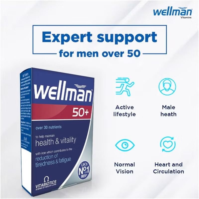 Vitabiotics Wellman 50+ Tablet is a comprehensive nutritional formula developed to safeguard the special nutritional needs of men aged 50 and above, from Wellman, the UK s number 1 men s supplement brand. The tablets are ideal for men with an active lifestyle; unlike a general multivitamin, Wellman 50+ contains specialist bioactive nutrients to help maintain health & vitality with specific support for male health, including iron, which contributes to the reduction of tiredness and fatigue. The supplement provides a range of vitamins, including vitamin C, vitamin E, vitamin D, and the B vitamins (such as B6, B12, and folic acid). These vitamins are essential for various bodily functions and can help support immune & heart health, energy production, and the maintenance of healthy bones, muscles, and cells. Folic acid and vitamins B6 & B12 contribute to normal homocysteine metabolism and normal red blood cell formation. The antioxidant effect of these vitamins (vitamin C & Vitamin E) also contributes to the protection of cells from oxidative stress. Wellman 50+ contains minerals like zinc, selenium, and magnesium, which play crucial roles in supporting immune function, cognitive health, normal vision, and maintaining normal muscle and bone health. Zinc in this comprehensive formula also contributes to the maintenance of normal testosterone levels in the blood and normal metabolism of fatty acids. Wellman 50+ is intended to be taken as a daily supplement to complement a healthy diet and lifestyle.
