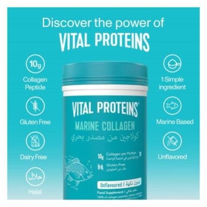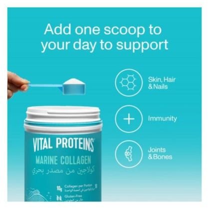 Vital Proteins Marine Collagen is developed to provide your body the boost it needs so you can look and feel your best! The powdered food supplement is halal certified and sourced from fresh, non-GMO certified, wild-caught cod skin and scales to ensure a natural, high-quality, and sustainable source of this ancient nutritional powerhouse. Made with only one ingredient, hydrolyzed collagen, the food supplement powder is easily and quickly digested and absorbed by the body. The collagen powder ensures cohesion, elasticity, and regeneration of your skin, hair, nails, tendons, cartilage, bones, and joints. All you need to take full advantage of this product is one scoop a day mixed with water or your favorite cold or hot dish or drink, be it coffee, tea, or a smoothie. Designed for your well-being, the unflavored and unscented Vital Proteins Marine Collagen is Paleo certified, Whole30 approved, and made without any added sugars, sweeteners, gluten, or dairy. The canister includes a scoop for measurement. Every 2 scoops (one serving) contain 10 g of marine collagen peptides.