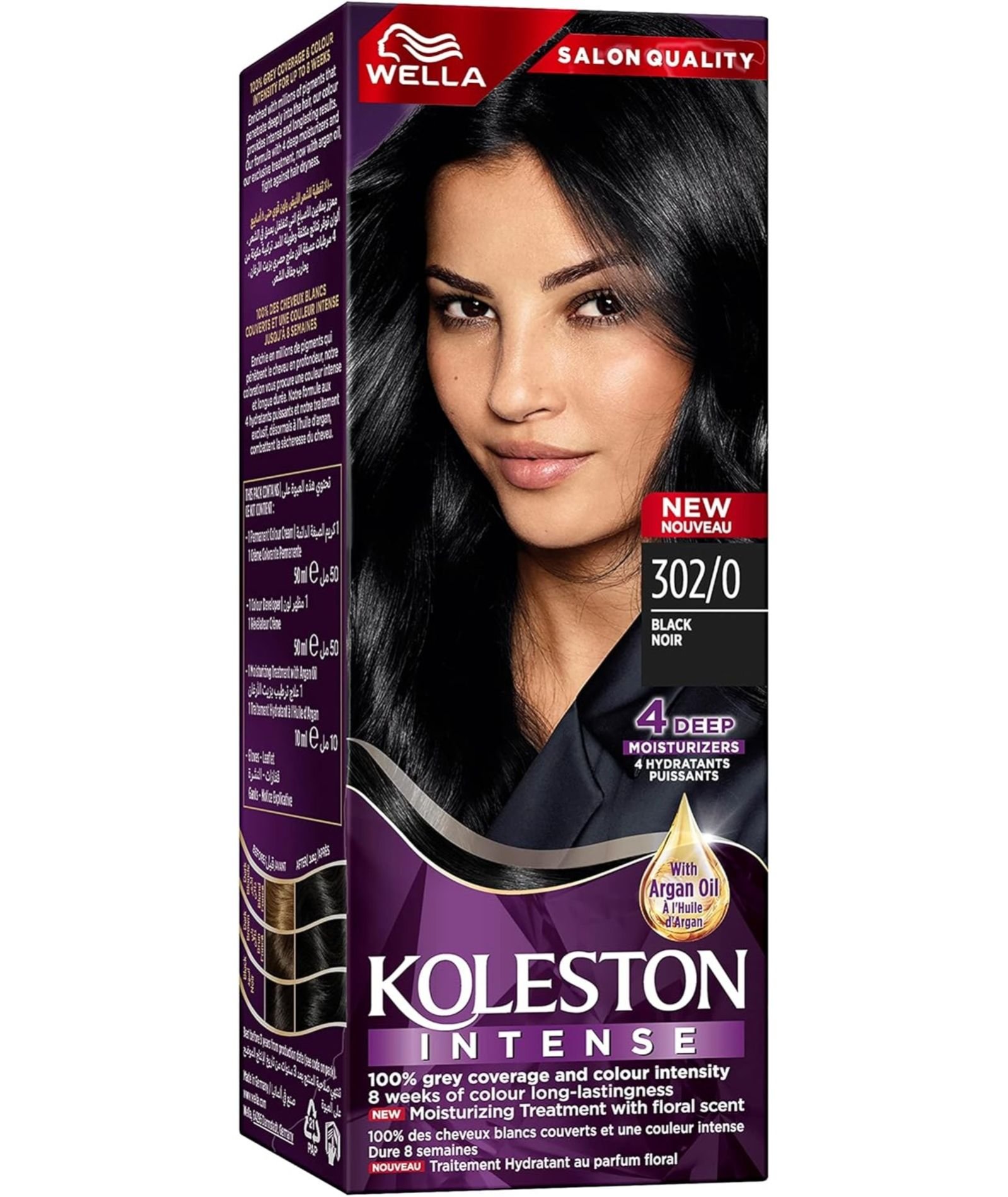 Wella Koleston Intense Hair Color 302/0 Black is a permanent hair dye formulated to give rich, uniform black color with 100% grey coverage. It contains moisturizing ingredients, including argan oil and multiple deep moisturizers, to keep hair soft, healthy, and radiant after coloring.
