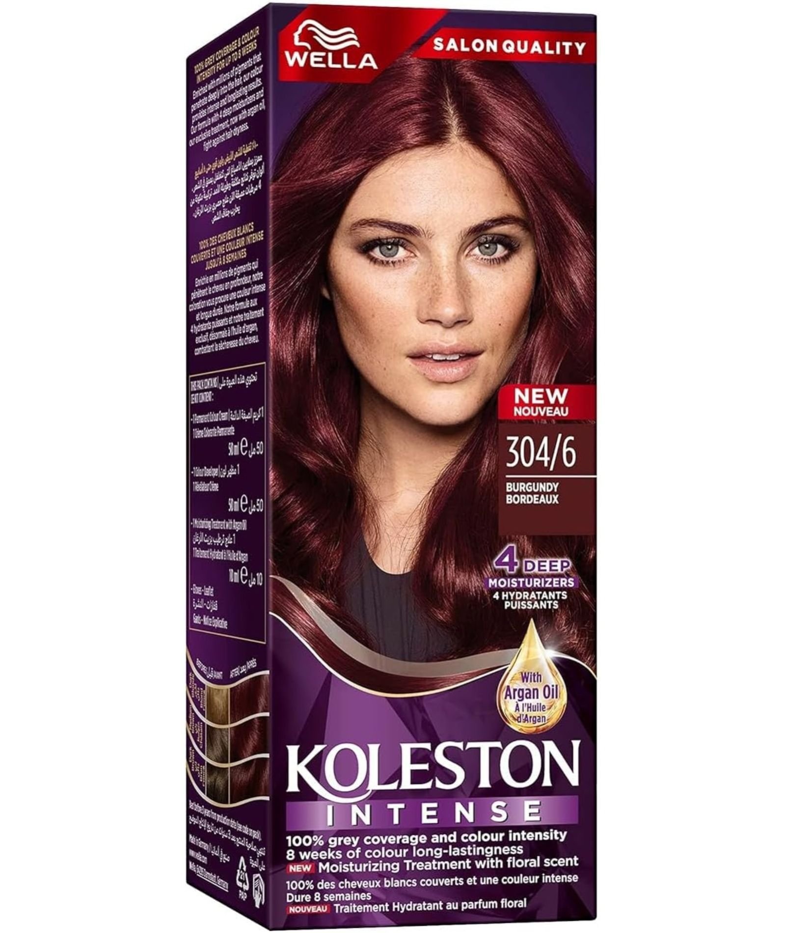 Wella Koleston Intense Hair Color 304/6 Burgundy is a permanent hair dye formulated to deliver full grey coverage and a vibrant, natural burgundy hue. The formula combines intense color pigments with nourishing ingredients like argan oil and multiple moisturizers to ensure hair remains soft, shiny, and healthy post-coloring.