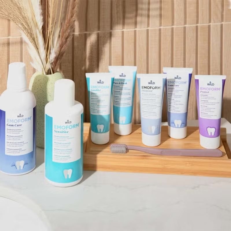 Wild Pharma Emoform Diamond Whitening toothpaste is a gentle whitening formula designed for daily oral and dental care, containing diamond particles and fluoride to prevent caries and plaque.