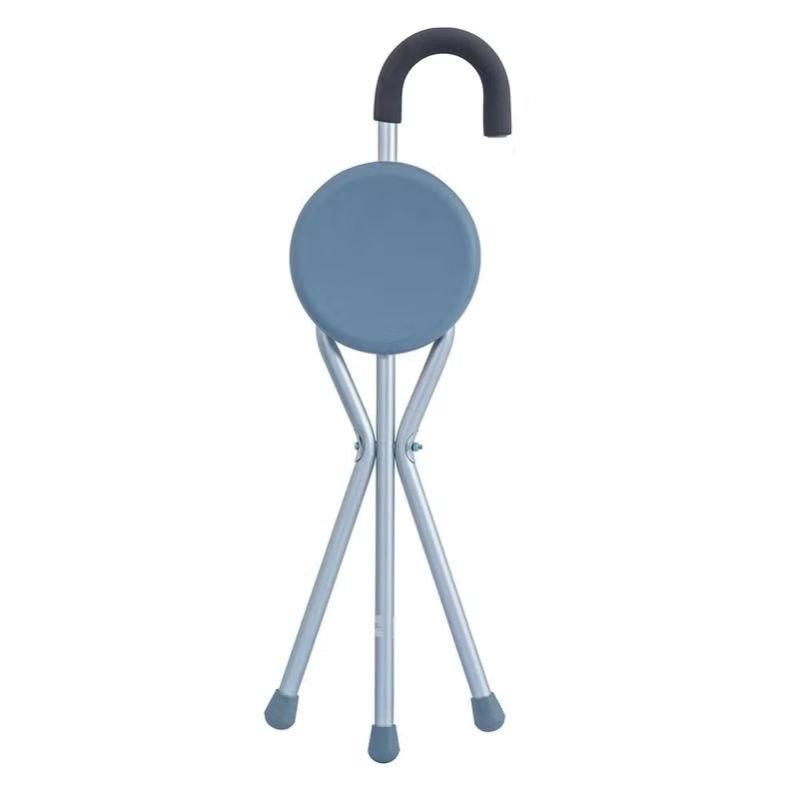 The lightweight, sturdy, and stylishly colored folding tripod cane features a comfortable round handle tube, rubber tip, and a PE seat panel.