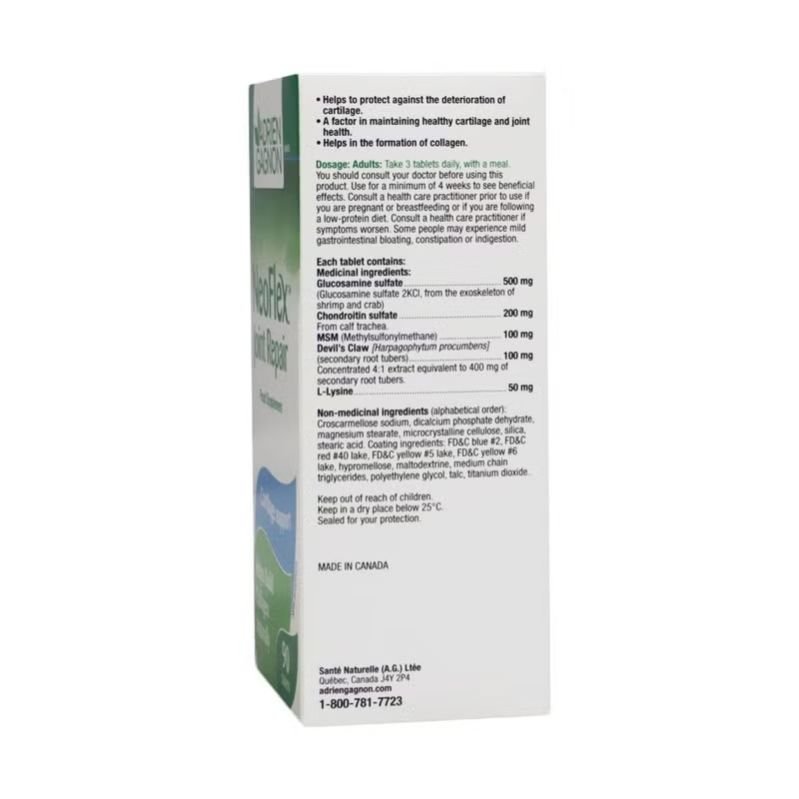 Adrien Gagnon NeoFlex Joint Repair Tablets contains Glucosamine Sulfate which is known to help strengthen the joints, and chondroitin cartilage arou helps the cartilage around the joints to become stronger and more flexible.