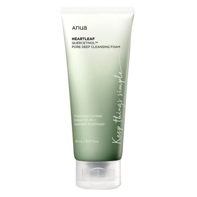 Anua Heartleaf Quercetinol deep pore cleansing foam is formulated for oily and combination skin, gently exfoliating dead cells and calming inflammation, with clinical studies showing over 98.8% pore cleanliness.