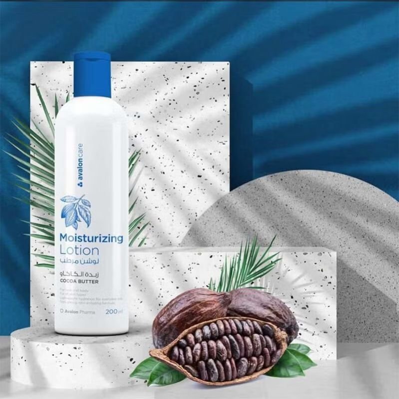 Avalon Care cocoa butter moisturizing lotion is designed for dry, sensitive skin, enriched with natural ingredients like avocado oil and Vitamin E for long-lasting hydration and skin protection.
