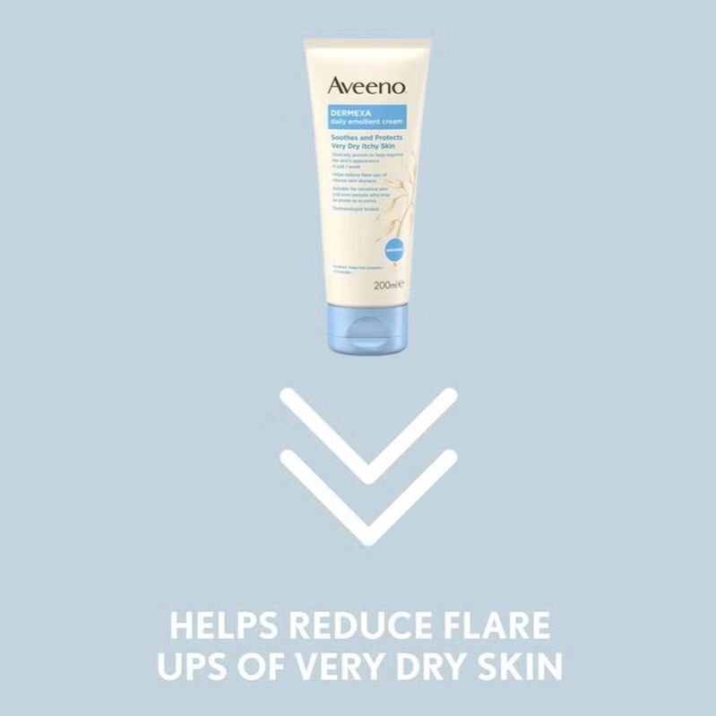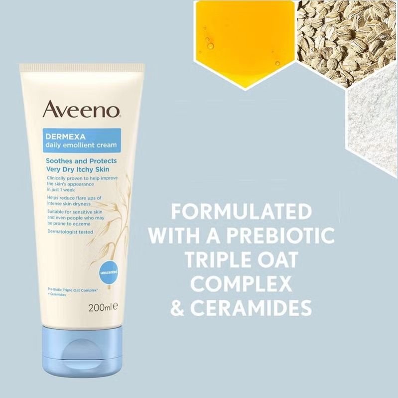Aveeno Dermexa Daily Emollient Cream soothes atopic allergies with prebiotic oat complex and ceramides, improving skin microbiome balance for healthy, resilient skin.