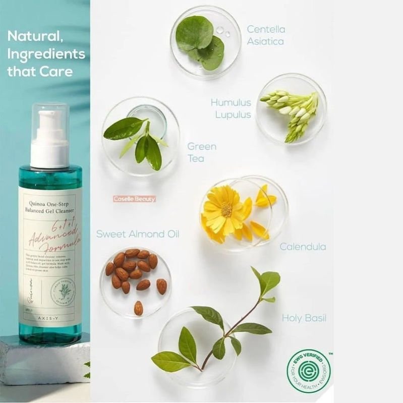 Axis-Y Quinoa One Step Balanced Clear + Hydrate Gel Cleanser is a gentle cleansing solution designed to remove makeup, sebum, and environmental impurities from the skin in a single step. The gel formula provides hydration to prevent dryness or stripping after washing. The cleanser consists of six base ingredients, one core goal-orientated ingredient, and one effective technology. The base ingredients include centella asiatica, calendula, green tea, sweet almond oil, hops, and holy basil. Centella asiatica boosts the skin s natural healing process, preventing acne scars. Calendula speeds up blemish healing, especially in tropical climates. Green tea increases benzoic acid levels, treating UV ray damage. Sweet almond oil protects the skin from oxidative stress and UV damage using vitamin E. Hops flushes out toxins contributing to blemishes, and holy basil clears bacteria and reduces inflammation using beta-caryophyllene. The core goal-orientated ingredient is quinoa, which supports collagen and elastin synthesis, promoting supple and smooth skin. The cleanser s pH level of 5.5 matches the skin s natural pH, which is generally slightly acidic, ensuring the cleanser doesn t disrupt the skin s natural balance while effectively cleansing.