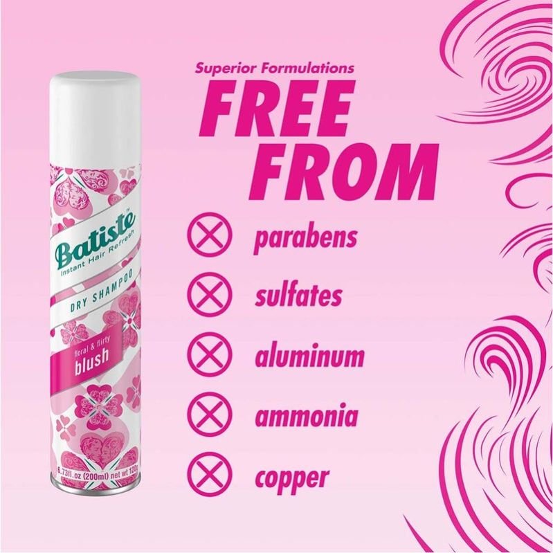 Bursting with fabulous fragrance that lasts all day, Batiste Blush Dry Shampoo is perfect to use between washes for instant hair refreshment. The essence of femininity, Blush is the floral, flirty way to turn heads. A few quick sprays instantly leave hair feeling clean, fresh, and full of body and texture.