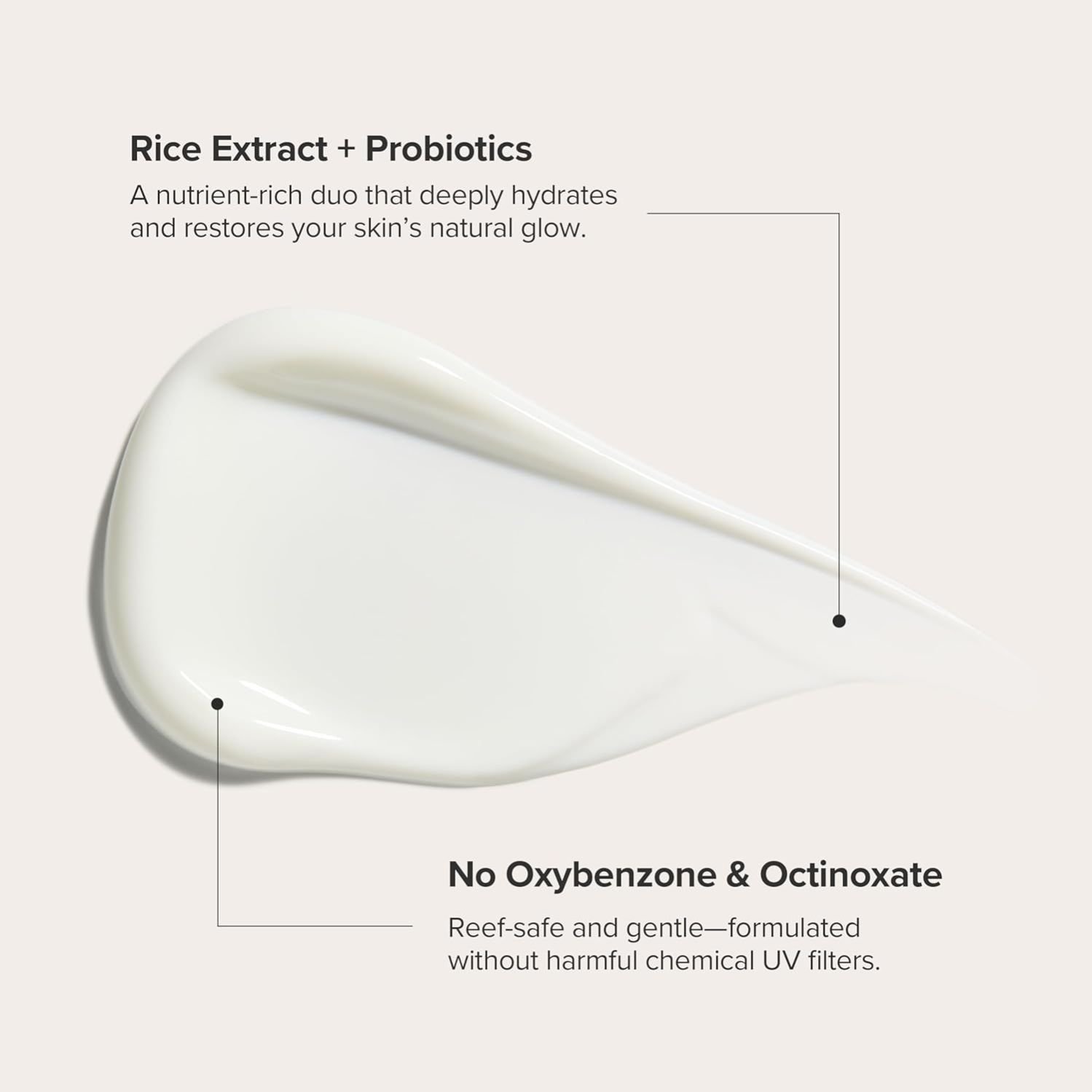 Organic sunscreen with calming, anti-inflammatory benefits, formulated with rice extract and fermented extracts, lightweight, non-sticky, suitable for daily sun protection, and ideal for sensitive skin.