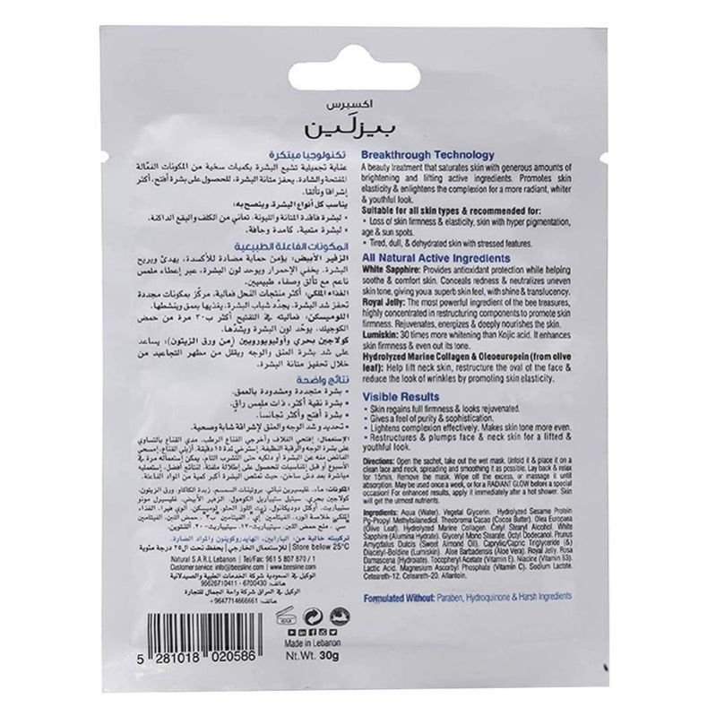 Beesline® Apitherapy White Sapphire Luxury Facial Mask is a luxurious sheet mask that saturates the skin with generous amounts of brightening & lifting active ingredients while promoting the skin’s elasticity for a more radiant, youthful complexion. Highly nutritious, Royal Jelly regenerates the cells and tissues, leading to an increased collagen synthesis for tighter, firmer skin. White Sapphire supports a natural and well-balanced complexion, correcting skin imperfections while helping to soothe and comfort skin. Suitable for all skin types & recommended for loss of skin firmness & elasticity, skin with hyperpigmentation, age & sun spots, and tired, dull, & dehydrated skin with stressed features.