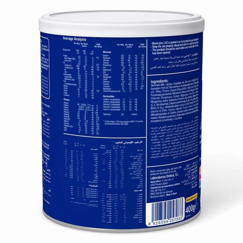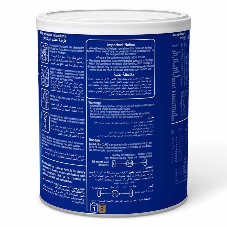 Blemil Plus 2 AC is a cow milk-based formula for infants prone to constipation, which fully meets the nutritional needs of newborns from 6 months onwards as part of a varied diet. It is effective for treating constipation that often accompanies the introduction of new foods into your baby's diet. Blemil Plus 2 AC has 45% (β-palmitate), for greater absorption of calcium and for preventing hard stool and constipation. Blemil Plus 2 AC has prebiotics (FOS) for the regulation of intestinal transit and to boost immunity. In addition, magnesium absorbs water in the bowels, hydrating and softening the stool, and thus increasing bowel movements. Besides, Blemil plus 2 AC is rich in zinc, calcium, iron, and 13 vitamins, including vitamin D and vitamin C for boosting the immune system. The bioactive compounds like taurine & L-carnitine and essential fatty acids (DHA, AA) present in this infant milk formula contribute to cognitive and visual function development. NOTE: Breast milk is the ideal food for the infant during the first months of life, as it provides all the nutrients and immune agents it needs for its proper development. In the event that this is not possible or is insufficient, starter milks are an optimal alternative for infant feeding from the first day. Consult with your pediatrician to determine the type of milk most suitable for your baby.