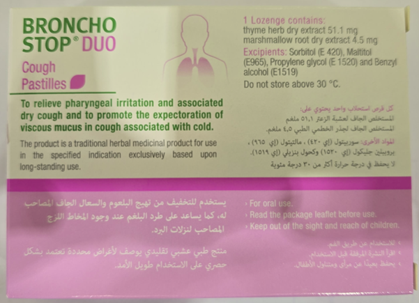 Bronchostop Duo Cough Pastilles 20s are a herbal remedy designed to relieve any type of cough, whether dry, tickly, or chesty. These pastilles contain thyme extract and marshmallow root extract, both known for their soothing and expectorant properties.