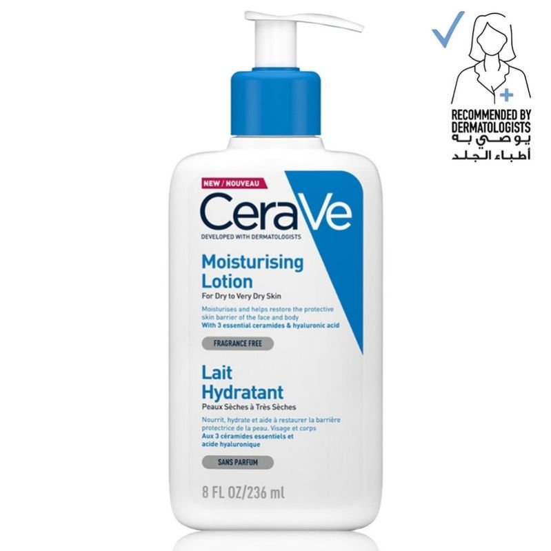 Daily lightweight moisturising lotion for dry to very dry skin, containing 3 essential ceramides and hyaluronic acid, is fragrance-free, hypoallergenic, and gentle on skin.