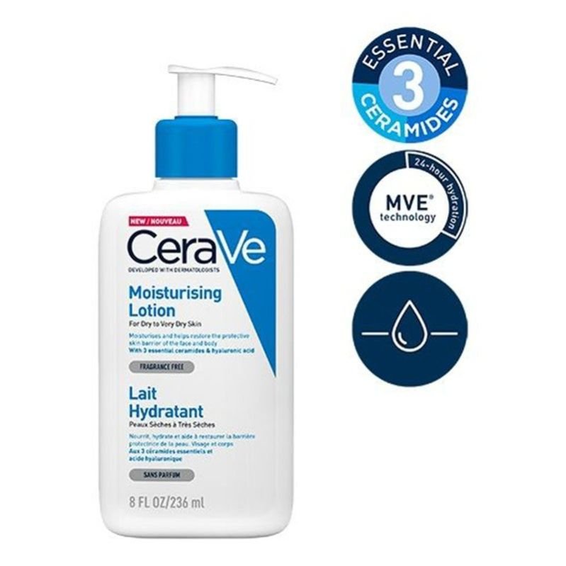 CeraVe Fragrance Free Moisturising Lotion is a lightweight body lotion that provides 24-hour hydration with three essential ceramides to protect the skin s natural barrier. It is specifically formulated for dry, sensitive skin and is enriched with naturally occurring ceramides and hyaluronic acid, which are essential for supporting the skin barrier and retaining moisture. CeraVe uses patented MVE delivery technology to replenish ceramides and deliver controlled, long-lasting hydration. Ceramides, which make up about 50% of the skin s lipids, are the glue that holds skin cells together, helping to maintain a healthy skin barrier. Lower ceramide levels are linked to skin conditions like acne, eczema, psoriasis, and rosacea. Sun exposure, harsh climates, and age can also impact ceramide levels, contributing to dry skin. CeraVe contains a blend of three essential ceramides, identical to those found naturally in the skin, to replenish natural lipid levels and restore a healthy skin balance. MVE technology encapsulates ceramides, ensuring continuous delivery to the skin s barrier. The product continues to work after application, hydrating the skin all day in just one use.