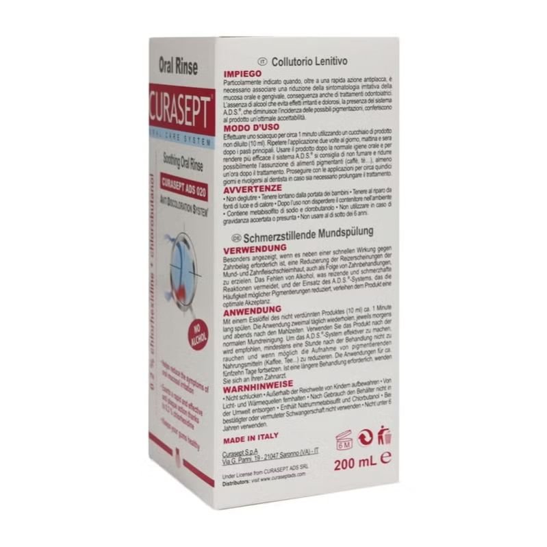 Curasept ADS Soothing Mouthwash offers rapid anti-plaque action and relief of irritative symptoms, with an alcohol-free formula and the A.D.S.® system reducing tooth pigmentation.