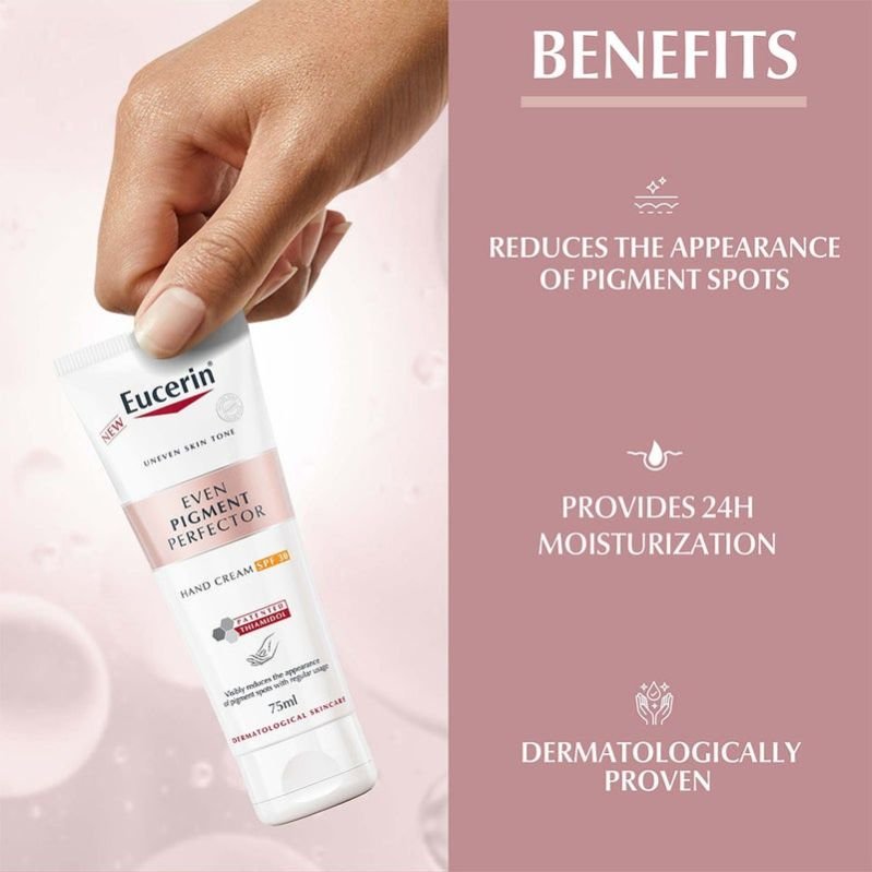 Eucerin Even Pigment Perfector SPF 30 Anti-Pigment Hand Cream is developed to help reduce pigment spots in the skin to reveal beautiful hands with even and radiant skin. It is incorporated with Thiamidol to reduce the appearance of pigment spots and prevent reappearance with regular usage. Thiamidol, an effective and patented ingredient that acts at the root cause of hyperpigmentation by reducing melanin production. It is clinically and dermatologically proven to reduce dark spots and prevent their reappearance. This hand cream is not only proven to reduce dark spots but also prevent their reappearance. With regular use, see visible results after two weeks and witness further improvement in the skin over time. The formula containing Hyaluronic Acid easily absorbs into the skin to provide and retain moisture all day long, keeping hands well hydrated and nourished. Hand cream absorbs quickly and moisturises for 24 hours. SPF 30 provides additional protection from future sun-induced age spots. With UVA and UVB filters (SPF 30), the correcting hand cream offers effective protection from the sun and reduces the chances of skin developing sun-induced pigment spots. Pigment spots on the hands are visibly reduced, and skin appears even and radiant with regular use. Even the Pigment Perfector range has been specially formulated with our patented ingredient, Thiamidol, to effectively reduce hyperpigmentation for more even and radiant skin. Beauty doesn t have to be complicated. It just needs to work. After all, your skin is the body s largest organ, and it deserves good care, too. That s why Eucerin is trusted by dermatologists, recommended by pharmacists, and loved by consumers worldwide as the brand that delivers healthy, beautiful skin for everyone. Discover the life-changing power of Eucerin s dermatological skincare products, from moisturisers and sunscreens to foot care products and more.