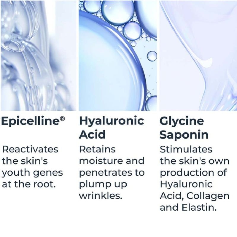 Epicelline premium anti-aging face serum, enriched with patented key active Epicelline, formulated with micro and macro hyaluronic acid, and Age Clock Technology, ideal for all skin types.