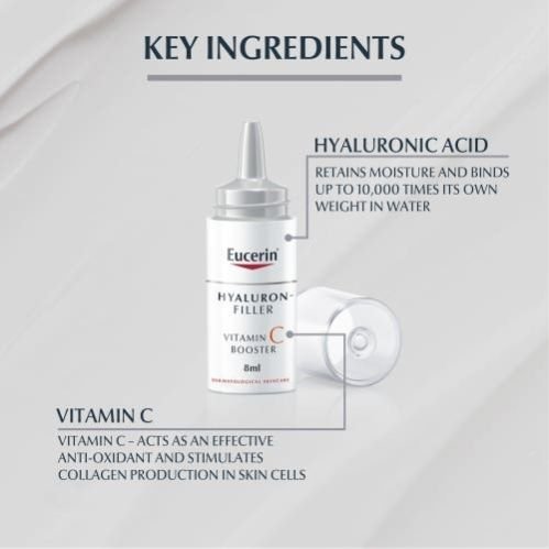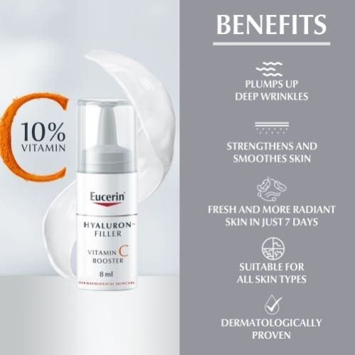 Eucerin Hyaluron-Filler Vitamin C Anti-Ageing Booster Serum contains 10% pure vitamin C, which is an effective antioxidant and helps the skin s appearance. Also, it has low molecular Hyaluronic acid that penetrates the epidermal skin layers where wrinkles originated. The sun, pollution, smoking, and other aspects of our lifestyles trigger the formation of free radicals. Free radicals cause oxidative stress to skin, accelerate premature skin ageing, and leave skin looking dull. Eucerin Hyaluron-Filler Vitamin C Booster with 10% pure and freshly activated Vitamin C has been specially formulated to fight free radicals and address the first signs of ageing: it strengthens skin, plumps up wrinkles, and gives you a smoother, fresher, and more radiant look. Innovative packaging ensures that the pure Vitamin C is freshly activated on first use. Simply press and shake to combine the Vitamin C powder into a serum of low molecular Hyaluronic Acid, and Licochalcone A. The formula is at its most effective for 21 days. Low molecular Hyaluronic Acid is an effective moisturiser that plumps up wrinkles in the epidermal (outermost) layers of skin. Another proven antioxidant, Licochalcone A, works alongside Vitamin C to neutralise the free radicals caused by UV and high-energy visible (HEVIS) light. Eucerin Hyaluron-Filler Vitamin C Booster is suitable for all skin types and is clinically and dermatologically proven to strengthen skin and plump up wrinkles. Skin becomes smoother, fresher, and more radiant in just seven days, and results improve over time.