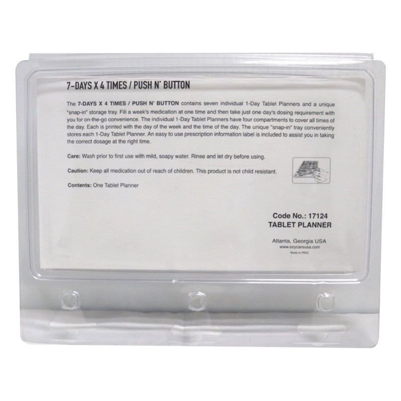 Ezycare 7 Days 4 Times Push N Button Tablet Planner contains seven individual 1-day tablet planners and a unique snap-in storage tray. Fill a week s medication at one time and then take just one day’s dosing requirement with you for on-the-go convenience. The individual tablet planners have four compartments to cover all times of the day.