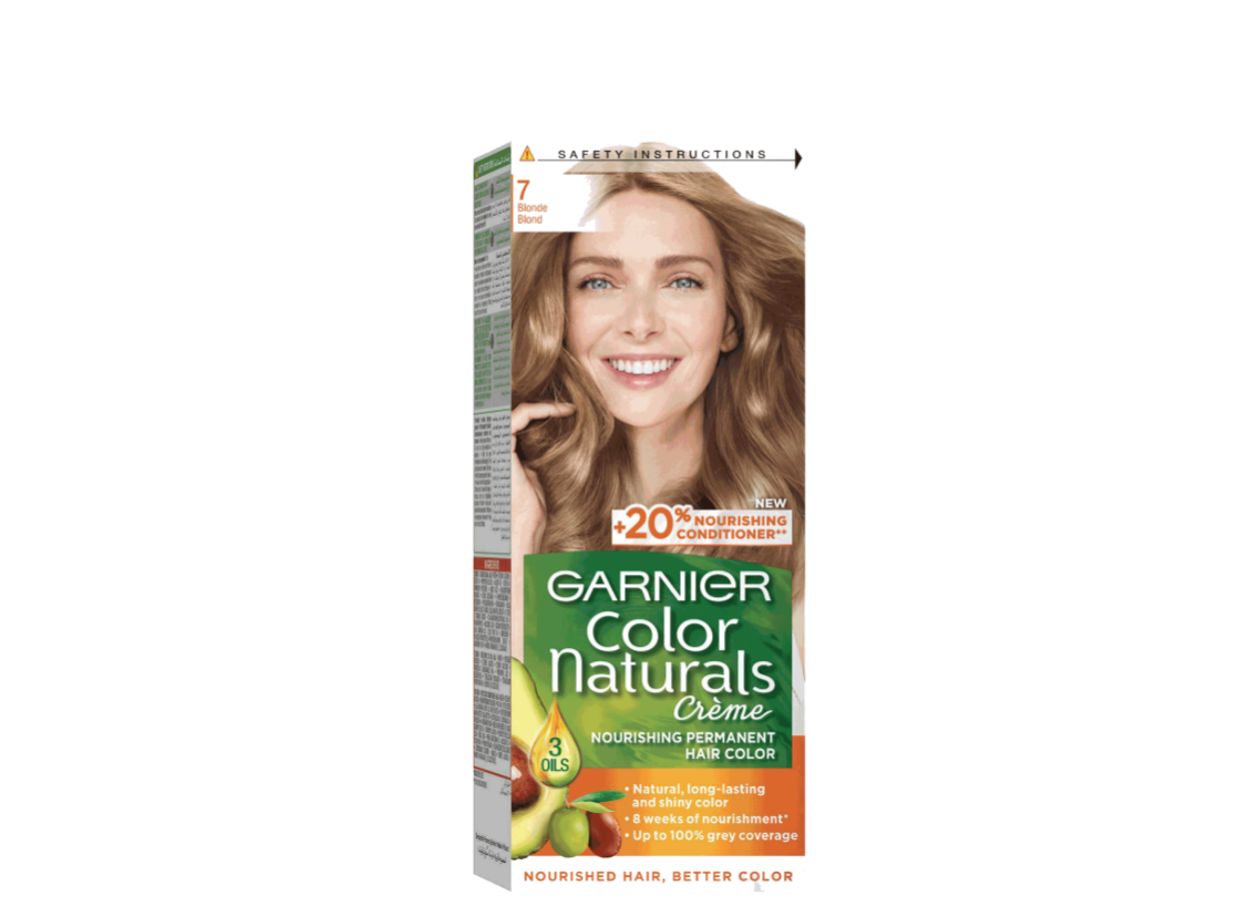 Garnier Color Naturals 7.0 Blonde is a permanent hair color cream with olive, avocado, and shea oils, offering a natural blonde shade and 100% grey coverage.