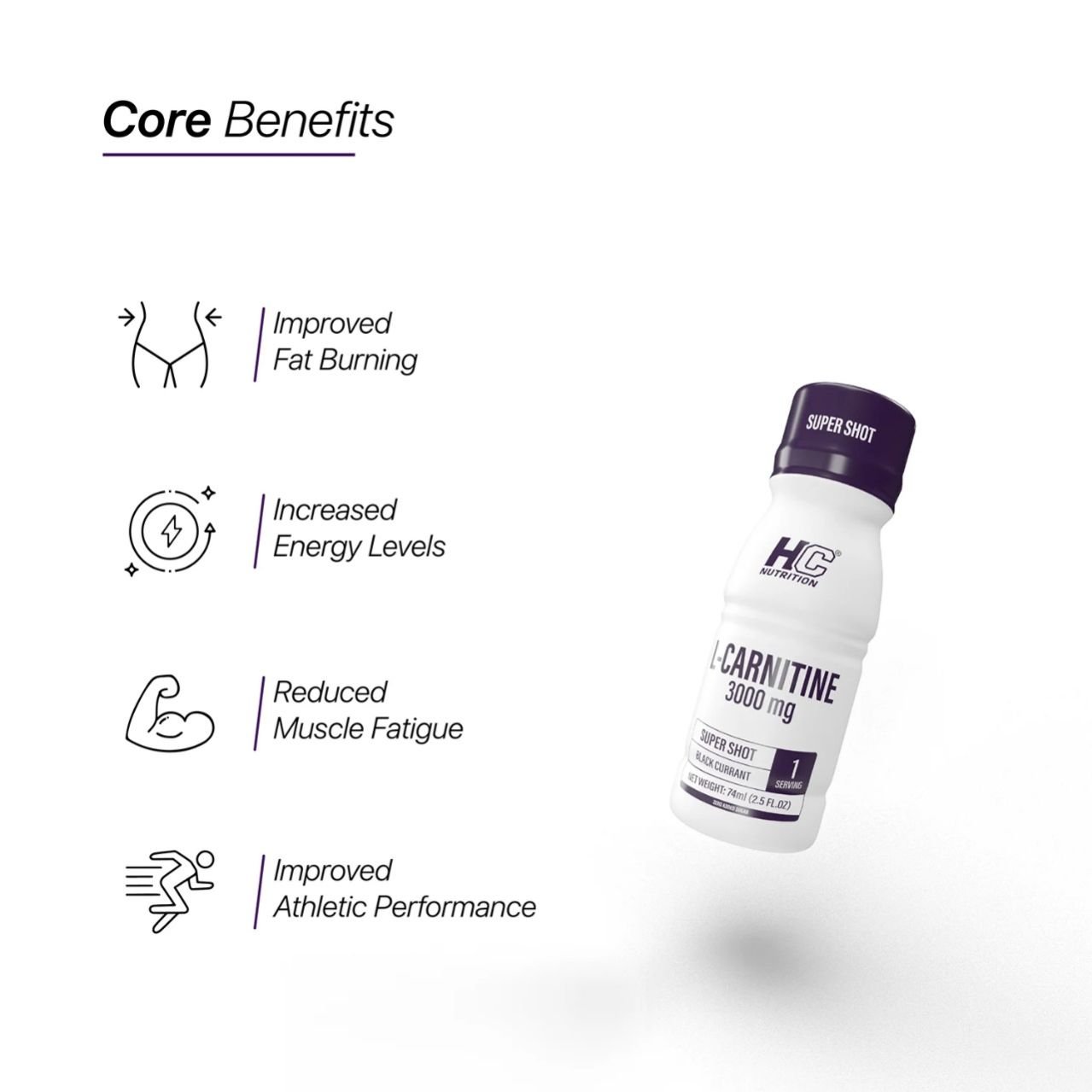 HC Nutrition s L-Carnitine Shot, a 74 ml, gluten-free, vegetarian, and third-party tested product, provides a quick, powerful fitness boost with 3000 mg of L-Carnitine, enhancing energy and metabolism.