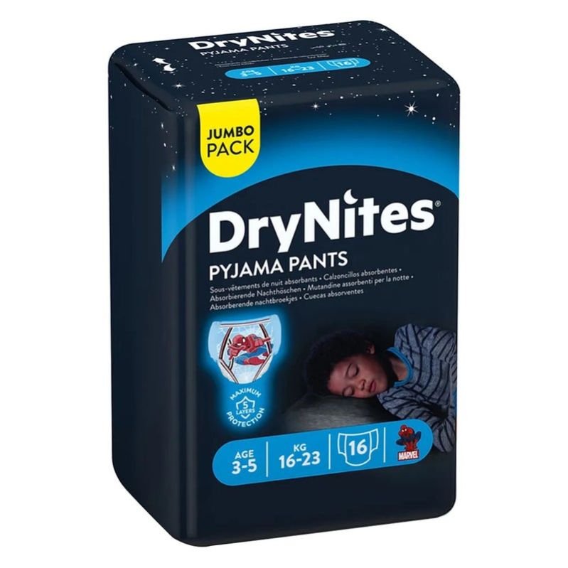 Huggies DryNites Pyjama Pants are the ultimate solution for worry-free nights and maximum protection from bedwetting. They are designed to help kids who are dry during the day but having accidents at night manage their bedwetting. All while keeping them dry, rested, and ready to wake up awesome!. They provide an ideal solution as they transition from diapers to underwear in their potty training journey. Designed with five layers of absorbency, these premium pyjama pants offer unparalleled protection for dry nights. They ensure your growing child stays dry and comfortable throughout the night by effectively locking away wetness and preventing leaks. No more disrupted sleep or uncomfortable bedwetting. DryNites® Pyjama Pants’ absorbent padding, waistband, body side liner and outside cover are all important parts of how DryNites® work. Firstly, super absorbent padding pulls in fluid to provide unbeatable nighttime protection. The body side liner then pulls in fluid and helps provide a layer of protection for your child s skin. The waistband, inside flap and leg elastics provide a snug fit while keeping wetness in. The outside cover also helps keep wetness in, just in case. Crafted with soft and stretchy sides, Huggies DryNites youth pants offer a snug and comfortable fit. The stretchable material allows freedom of movement, ensuring a secure and flexible experience for your little one. Staying dry at night has never been easier! Featuring captivating Marvel character designs, these night pants are a delight for young boys. The vibrant and engaging prints make bedtime fun and exciting. The pyjama pants also provide the discretion of real underwear for your child to feel like a big kid. Support your child s growth journey with Huggies DryNites Pyjama Youth Pants and help them feel confident, secure, and full of joy. At Huggies, since 1968, they have believed in keeping your baby s skin clean, healthy, and soft. Their pathbreaking innovations in infant care have helped generations of toddlers stay clean and healthy. Huggies continues to provide the same level of care With Huggies DryNites Pyjama Pants, making bedtime a comfortable and enjoyable experience. Huggies is always there for every stage of your baby’s development. It is the perfect choice for your child when it comes to protection you can trust. Discover a full range of Huggies baby items, such as wet wipes, diapers in all sizes, and swim nappies for little swimmers. Huggies has everything you need.