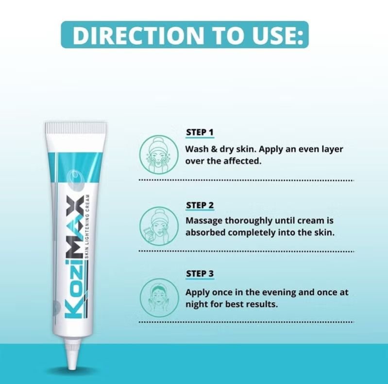 Information Combination of Kojic acid and Vitamin C Skin lightening teatment 15 g tube packing Description Kozimax Skin Lightening cream help to improve fairness of face. This cream brings revolution in skin lightning treatments. With the combination of 5% of Kojic acid and 10% of Vitamin�C (In stable form) keeps Kozimax unique. Arbutin add extra skin lightning effects. Kozimax contains Glabridin in its purest form.