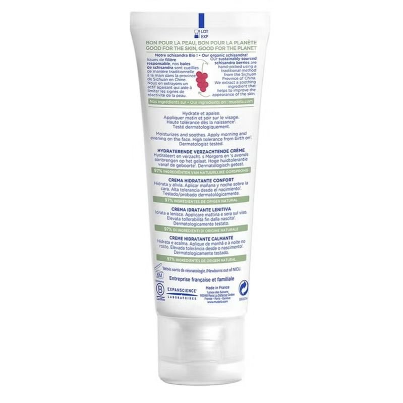 Mustela Soothing Moisturizing Face Cream is a gentle product that soothes and strengthens sensitive baby skin, improving its appearance and sensations of tingling and tightness and reinforcing the skin barrier.