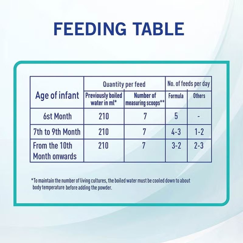 - Consult the feeding table and pour the exact amount of lukewarm water into the bottle. Only use a scoop from this container and level using the inner rim.