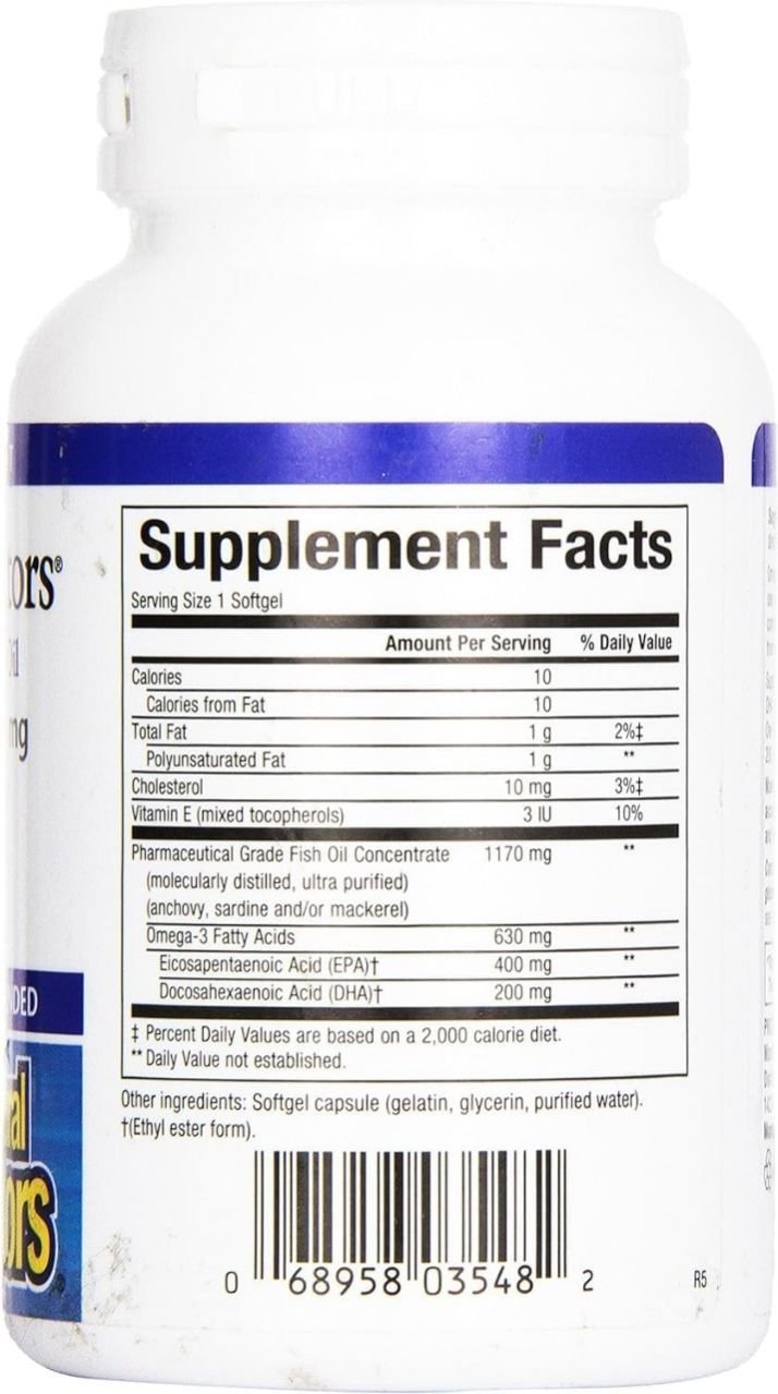 Natural Factors RxOmega-3 is a daily dietary supplement featuring a potent blend of 1360 mg of EPA and 670 mg of DHA omega-3 fatty acids