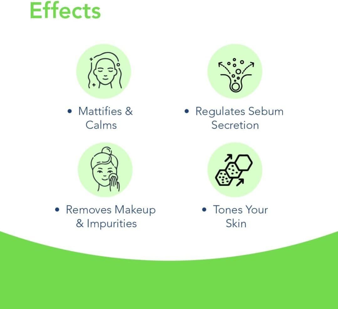 The micellar water effectively mattifies and calms skin, regulates sebum production, removes makeup and impurities, and tones the skin, preparing it for further skincare steps.