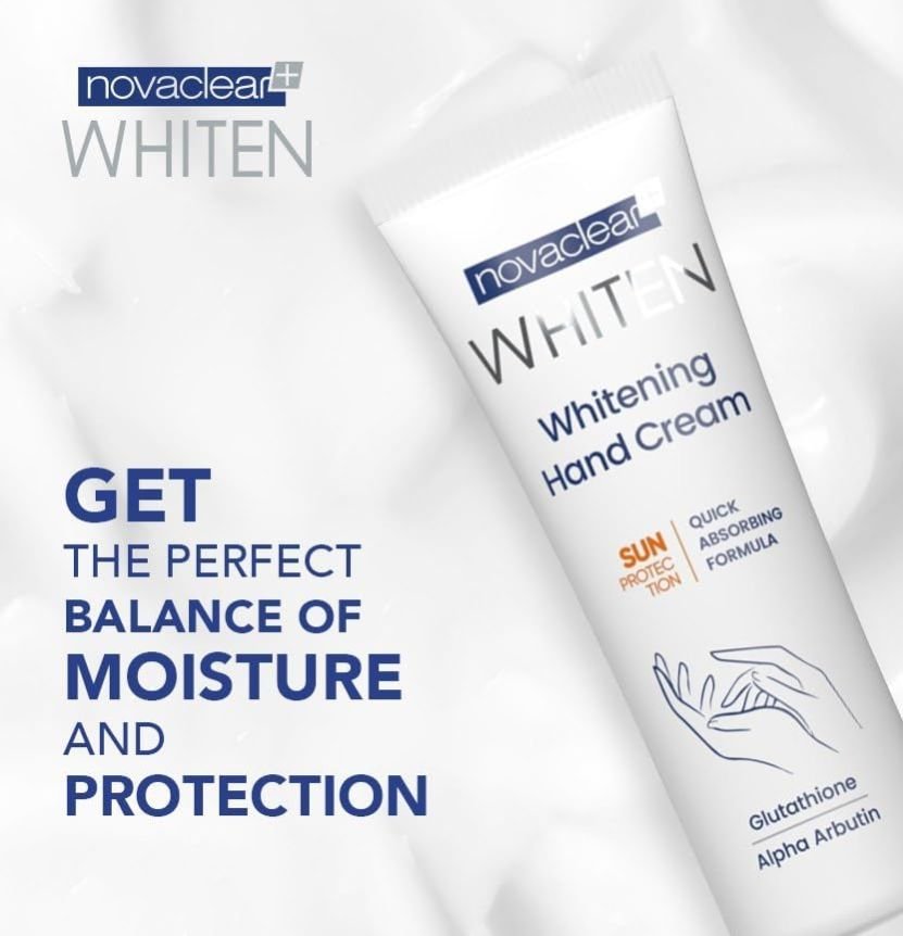 Novaclear Whitening Hand Cream is a skin-lightening and brightening product that contains Glutathione, Alpha Arbutin, Shea Butter, Sweet Almond Oil, and SPF for sun protection.