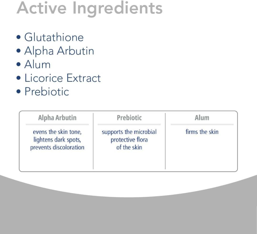 This gentle daily product brightens and evens skin tone with Alpha Arbutin and Glutathione, firms and tones with Alum, soothes and calms with Licorice Extract, and supports natural skin protective flora.