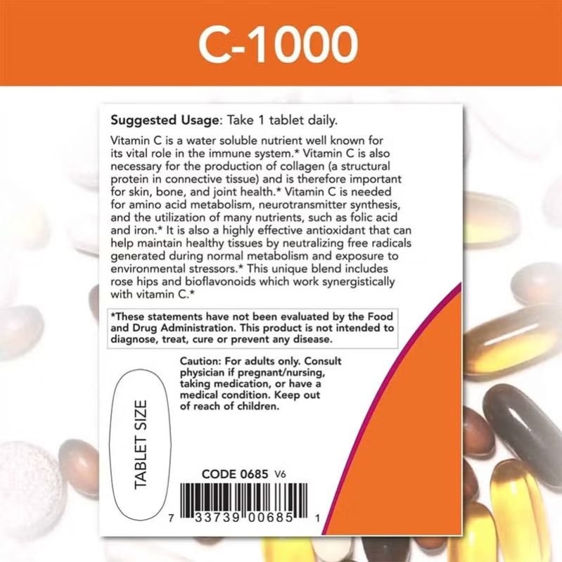 Now C-1000 Vitamin C Tablets For Antioxidant & Immune Support helps support your immune system as well as your body s antioxidant level. Vitamin C is a water-soluble nutrient well known for its vital role in the immune system. Vitamin C is an antioxidant nutrient that helps in building and boosting the immunity by eliminating the toxin from the body. Vitamin C, as a potent antioxidant, can prevent or slow cell damage caused by free radicals, hence preventing diseases. It also contributes to your immune defence system by supporting multiple cellular functions of your body s adaptive immune systems. Vitamin C helps encourage the production of white blood cells known as lymphocytes and phagocytes, which help protect the body against infection. It also helps these white blood cells function more effectively while protecting them from damage by potentially harmful free radicals. Free radicals are unstable molecules that the body produces as a reaction to environmental and other pressures. They can increase the risk of inflammation and various health issues. Free radicals, if not mopped up by the antioxidants, would cause inflammation, cancer, early ageing, and even heart disease. Vitamin C helps maintain healthy tissues by neutralising these free radicals generated during normal metabolism and exposure to environmental stressors. In addition to all these benefits, Vitamin C also plays a role in the production of collagen (a structural protein in connective tissue) and is therefore important for skin, bone, and joint health. Vitamin C is needed for amino acid metabolism, neurotransmitter synthesis, and the utilisation of many nutrients, such as folic acid and iron. This unique blend includes rose hips and bioflavonoids, which work synergistically with vitamin C.