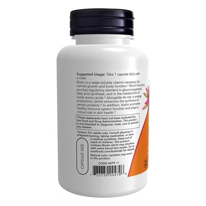 Now Biotin 5000 mcg Vegetarian Capsules For Energy Production helps you get adequate amounts of this essential nutrient for improved effectiveness. Biotin is a water-soluble vitamin necessary for normal growth and body function. Biotin functions as a key regulatory element in gluconeogenesis, fatty acid synthesis, and the metabolism of some amino acids. Biotin is necessary for the formation of fatty acids and glucose, which are used as fuels by the body. It is also important for the metabolism of amino acids and carbohydrates. A lack of biotin is rare. However, if you have Crohn’s disease, which limits the absorption of essential nutrients in the small intestine, you can likely have a biotin deficiency. If it occurs, it may lead to skin rash, loss of hair, high blood levels of cholesterol, and heart problems. Alongside its role in energy production, Biotin enhances the synthesis of certain proteins. In addition, Biotin promotes healthy immune system function and plays a critical role in skin health. This extra-strength product is 10 mg Biotin as compared to Now s other Biotin products—1 mg Biotin and 5 mg Biotin.