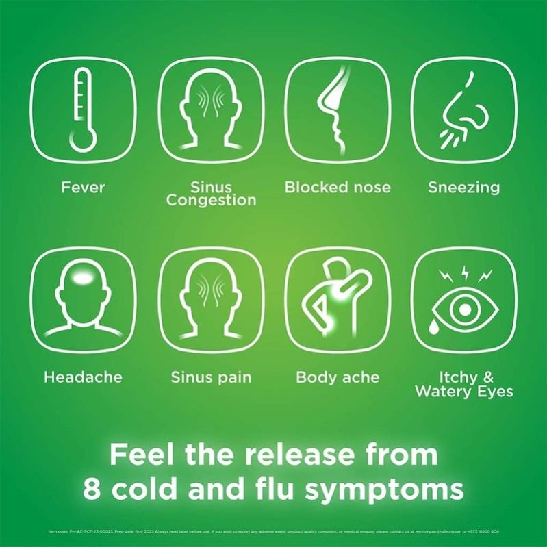 Panadol Cold and Flu Caplets, a combination of Paracetamol, pseudoephedrine, and chlorpheniramine, provide nighttime relief from cold and flu symptoms, including pain, congestion, and allergies.