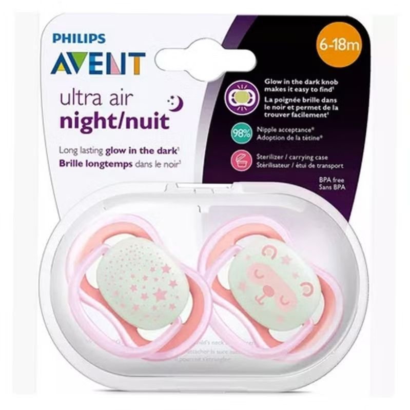 Philips Avent Ultra Air Silicone Soother Night Time For 6-18 Months Baby Girl is developed for toddlers aged 6-18 months and comes in a 2-pack. The silicone teat is taste- and odor-free, so it is more likely to be accepted by your baby. The orthodontic, drop-shaped symmetrical teat helps in the natural oral development of your child. It is smooth, transparent, and easy to clean and is strong and long-lasting, so it won t become misshapen or discolored over time. The small and lightweight design of the Philips Avent baby dummy fits your baby perfectly, and the ventilation holes allow for maximum airflow to prevent saliva build-up. The Philips Avent ultra air night has extra-large holes to keep skin dry and a glow-in-the-dark button so you can see it while the lights are out. A security ring handle enables easy removal of the dummy at any time, and it glows in the dark to make it easier to find at night. Philips range of babies dummies can be sterilized and are dishwasher safe. As the #1 recommended brand of mother & childcare products worldwide, Philips Avent prides itself on providing innovative baby products. For over thirty years, the brand has worked hand-in-hand with healthcare professionals, clinicians and moms to develop products with babies’ needs in mind. Philips Avent has a full range for you and your baby, from breastfeeding to bottle feeding, pacifiers and toddler cups. Philips Avent is here to help you build a healthy start for a happy baby.