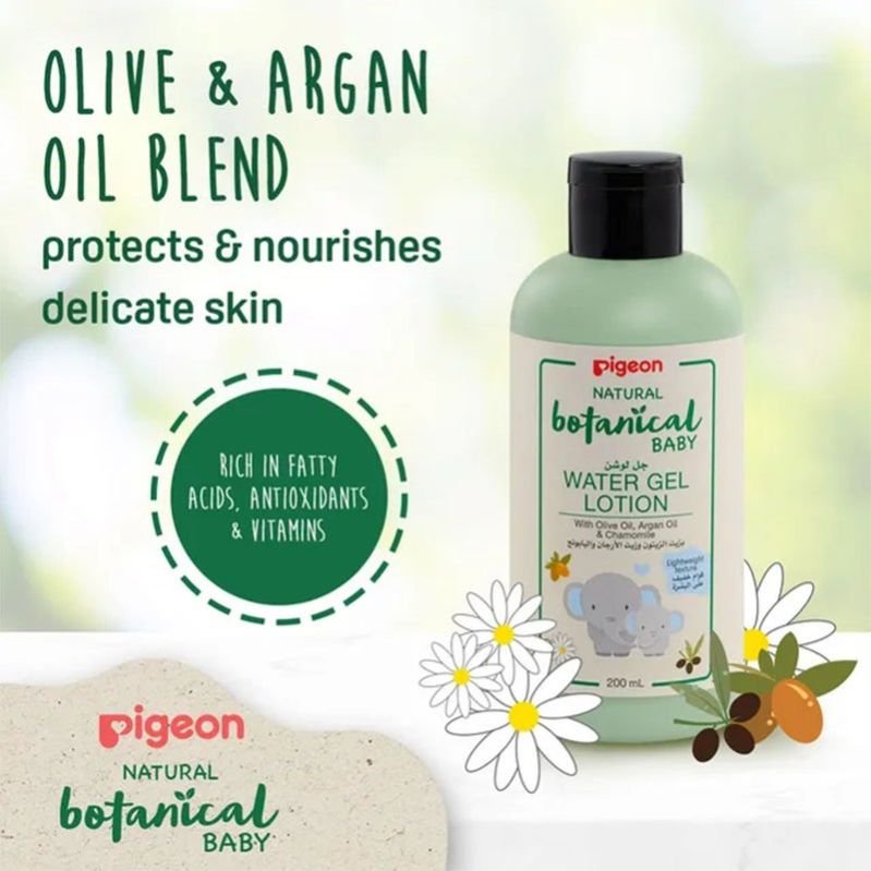 Pigeon Natural Botanical Baby Water Gel Lotion is a safe, lightweight, and hydrating solution for newborns, containing argan, olive oil, and chamomile extract.