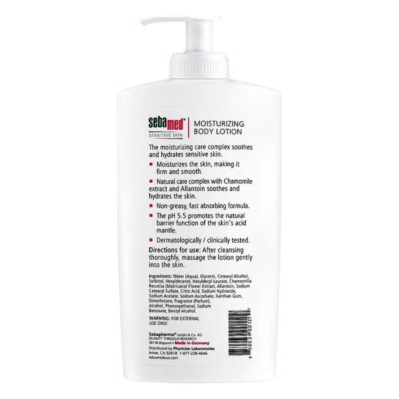 Sebamed Sensitive Skin Moisturizing Body Lotion is designed to deeply moisturize and nourish your skin while maintaining a pH level of 5.5, which supports your skin s natural hydrolipid barrier, also known as the acid mantle. This makes it suitable for even the most sensitive skin types and can be used on both normal and problematic skin conditions, such as eczema and psoriasis. Sebamed s Moisturizing Lotion is enriched with chamomile extract and allantoin, which are known for their soothing and calming properties. The lotion is formulated to provide intense hydration to your skin, helping to lock in moisture and keep it well-hydrated. The pH level of 5.5 is designed to match your skin s natural pH, which can help maintain the integrity of the skin s protective barrier. Sebamed Moisturizing Body Lotion has been developed by dermatologists and is recommended by them, which can provide a sense of trust in its quality and safety. The non-irritating formula is specifically created for sensitive skin types, making it a great option for those who may be prone to skin irritation or allergies. The lotion is designed to be rapidly absorbed by the skin, leaving no greasy residue behind. Overall, Sebamed Sensitive Skin Moisturizing Body Lotion appears to be a well-formulated product that can be a suitable choice for individuals with a variety of skin types, especially those with sensitive skin or specific skin conditions like eczema and psoriasis.