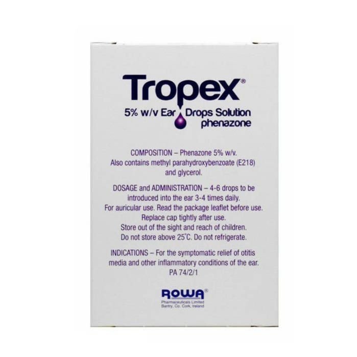Tropex Ear Drops contains phenazone, which is an analgesic ( Painkiller) and anti-inflammatory agent. Glycerol is used to soften and remove any earwax.