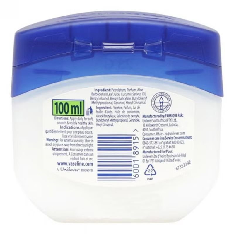 Vaseline Blue Seal Aloe Fresh Light Hydrating Jelly is a unique, light, fast-absorbing jelly that keeps your skin feeling fresh and hydrated all day long. Not only is it non-greasy, but it is also incredibly gentle on skin, hypoallergenic, and non-comedogenic (i.e., it will not block your pores). Like all other Vaseline petroleum jelly products, it has been triple purified to ensure the highest possible quality. Best for: dry skin, dry itchy skin, and cracked skin. Vaseline petroleum jelly is the original wonder jelly. It works by creating a sealing barrier between cells, which locks in moisture and speeds up your skin’s natural recovery from dryness, helping it restore from within. Its occlusive function also allows it to protect dry, cracked skin and minor cuts, scrapes, and burns. Jelly is triple-purified to be 100% pure.